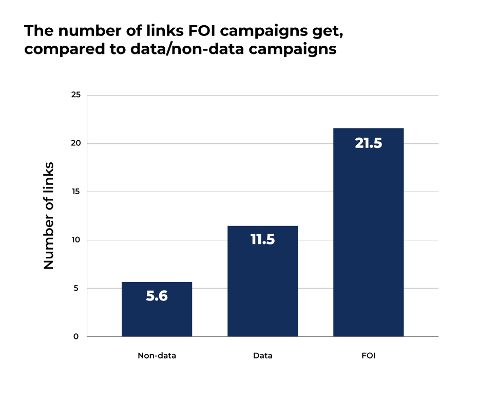 FOI campaigns generate nearly 4x the number of links on average compared to campaigns without data. Insights from our data team show that non-data campaigns typically deliver 5.68 links, compared to 21.5 links from FOI campaigns.