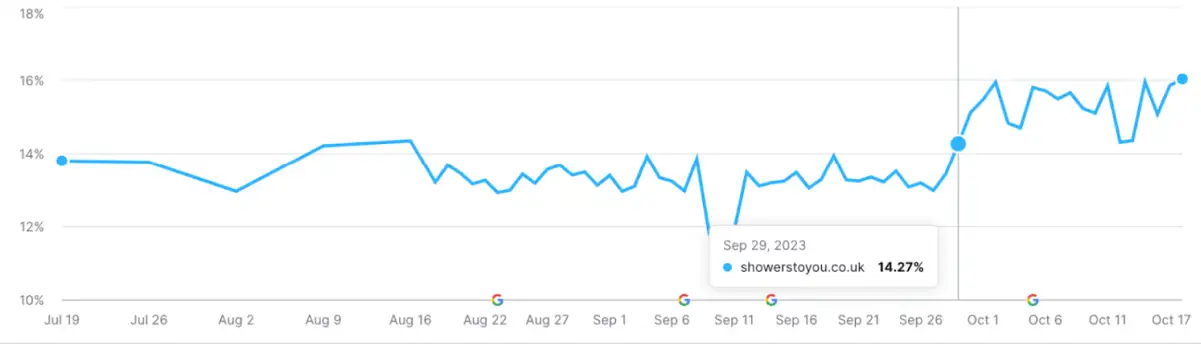 As we have continued rolling out campaigns and helping to make technical and on-site improvements, the domain’s organic rankings and visibility continues to grow. Showerstoyou.co.uk has seen nice growth in recent Google updates, which is having a meaningful impact on organic sales and revenue.