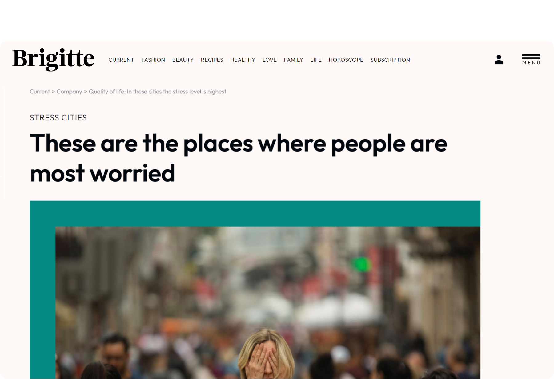 Due to the lack of context, DeepL has translated this headline incorrectly to “The most stressed German cities, ranking!”. It also used the wrong word for “most stressed”. Additionally, this is not a usual format for a German headline. Here is a real-life example from a publication of this campaign in the German magazine Brigitte: “Stress-Städte: An diesen Orten machen sich die Menschen die meisten Sorgen”. This roughly translates to: “Stress-Cities: These are the places where people worry the most”.