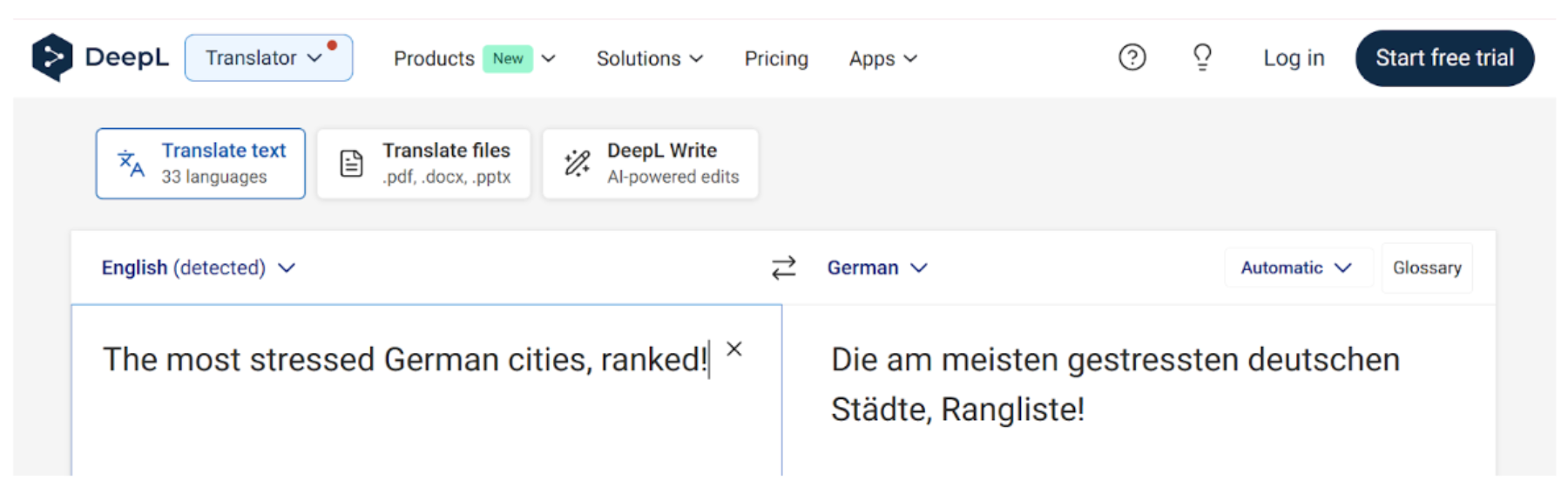 While “The most stressed German cities, ranked!” may be a perfectly suitable headline in English, there are several issues with the translation provided by AI (in this case DeepL): “Die am meisten gestressten deutschen Städte, Rangliste!”.