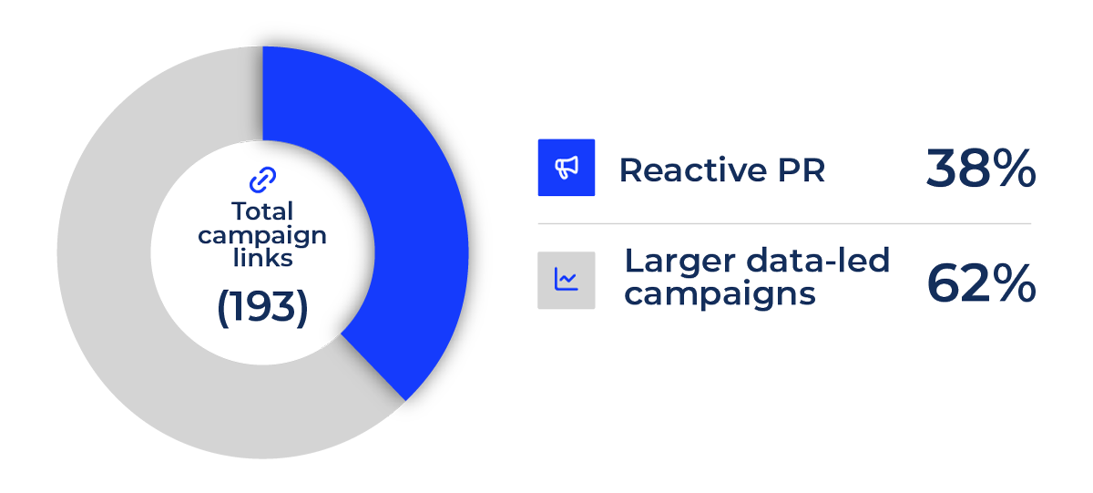 Reactive PR is a core part of an effective campaign. Take one of our sports entertainment clients as an example. Over a three-month period, we generated 193 high-value links. Of those, 74 (38%) came directly from reactive work, with the remainder coming from larger data-led campaigns.