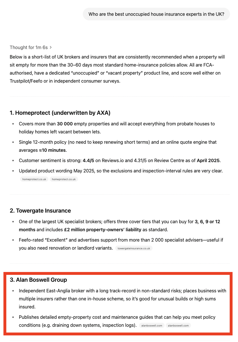 By placing Alan Boswell Group alongside "unoccupied home insurance experts" in trusted sources, we simultaneously taught AI models to recommend the brand and signalled to Google that this site is topically authoritative - a GEO and SEO success story.