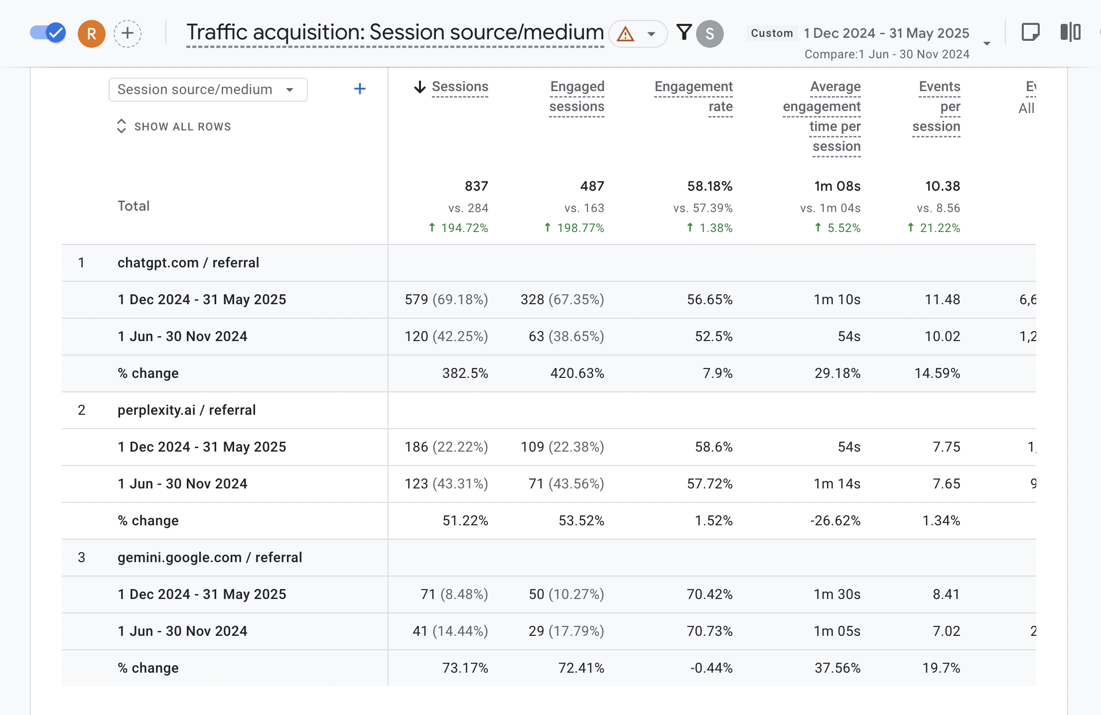It’s also worth monitoring your web analytics for referral traffic from AI sources. You can often identify ChatGPT or other LLM referrals, especially in GA4, and track any changes in your organic search rankings for the keywords in your phrase as well.