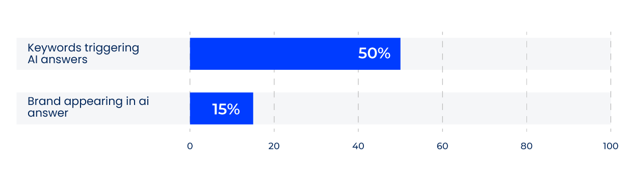 Our analysis of the GEO audits we’ve conducted in the last year reveal that, on average, over half of a brand’s ranking keywords now trigger AI answers - but it can be as much as 76%