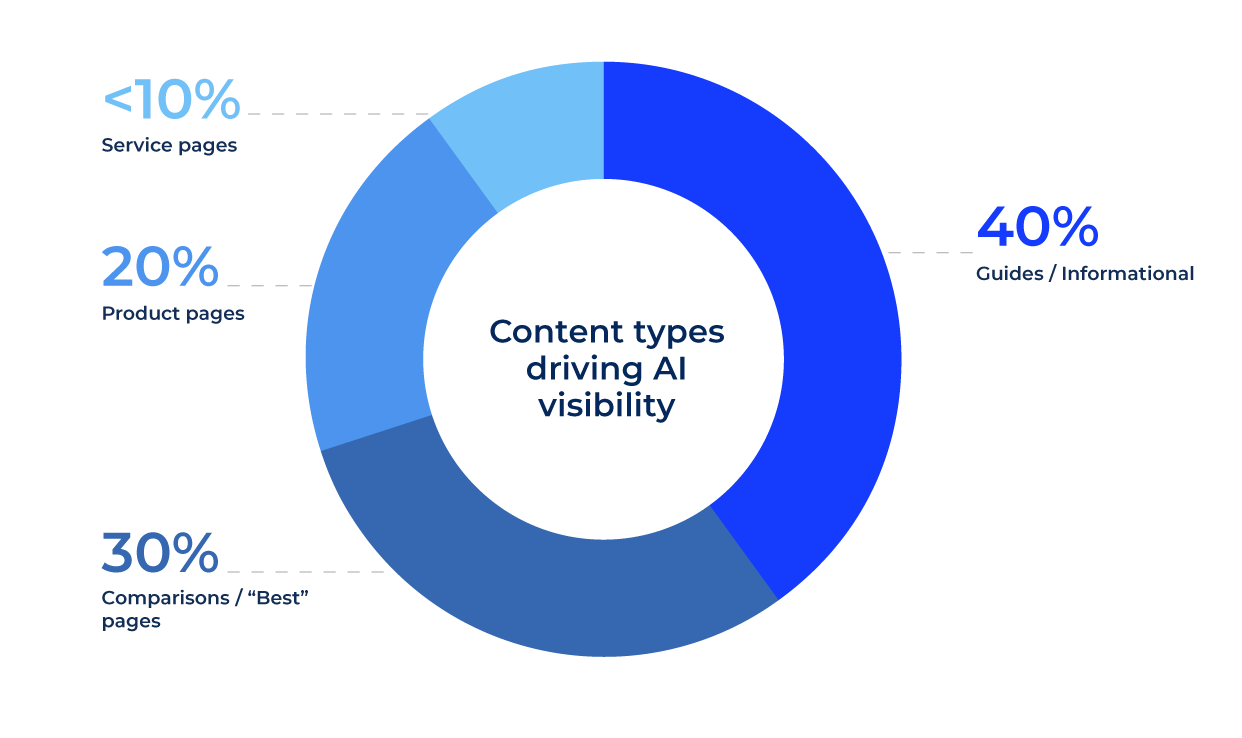 Data from our GEO audits revealed that informational content generated 40-70% of AI traffic for brands.