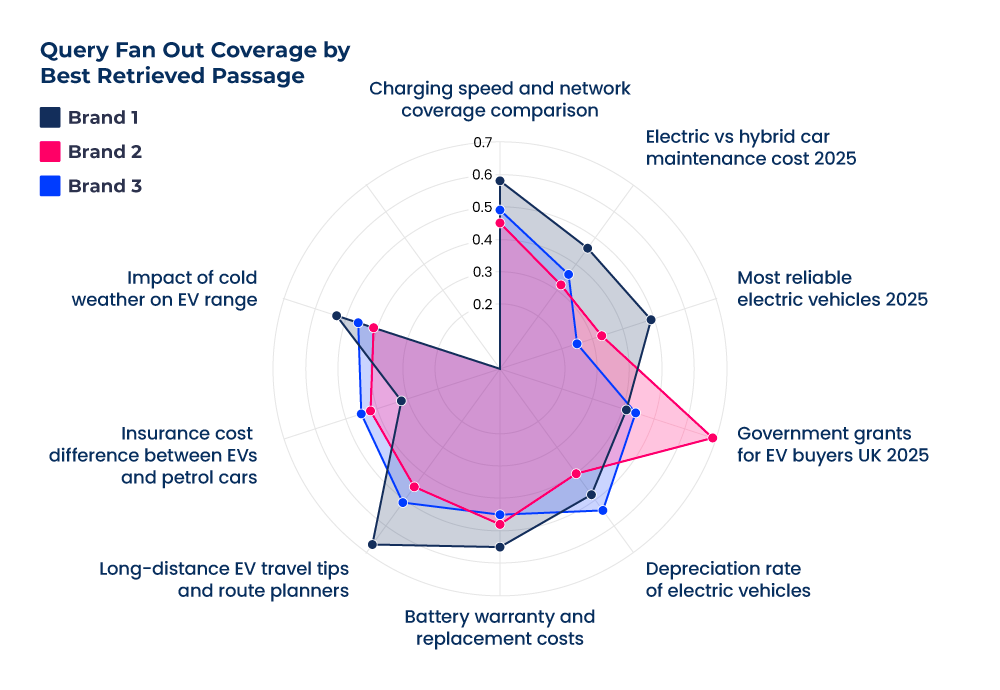 Each spoke is a related question on the same topic. The coloured shapes show how well different sites cover those questions. The fuller the shape, the broader the coverage. Brands that cover more of a topic’s related questions are more likely to be cited in AI answers.