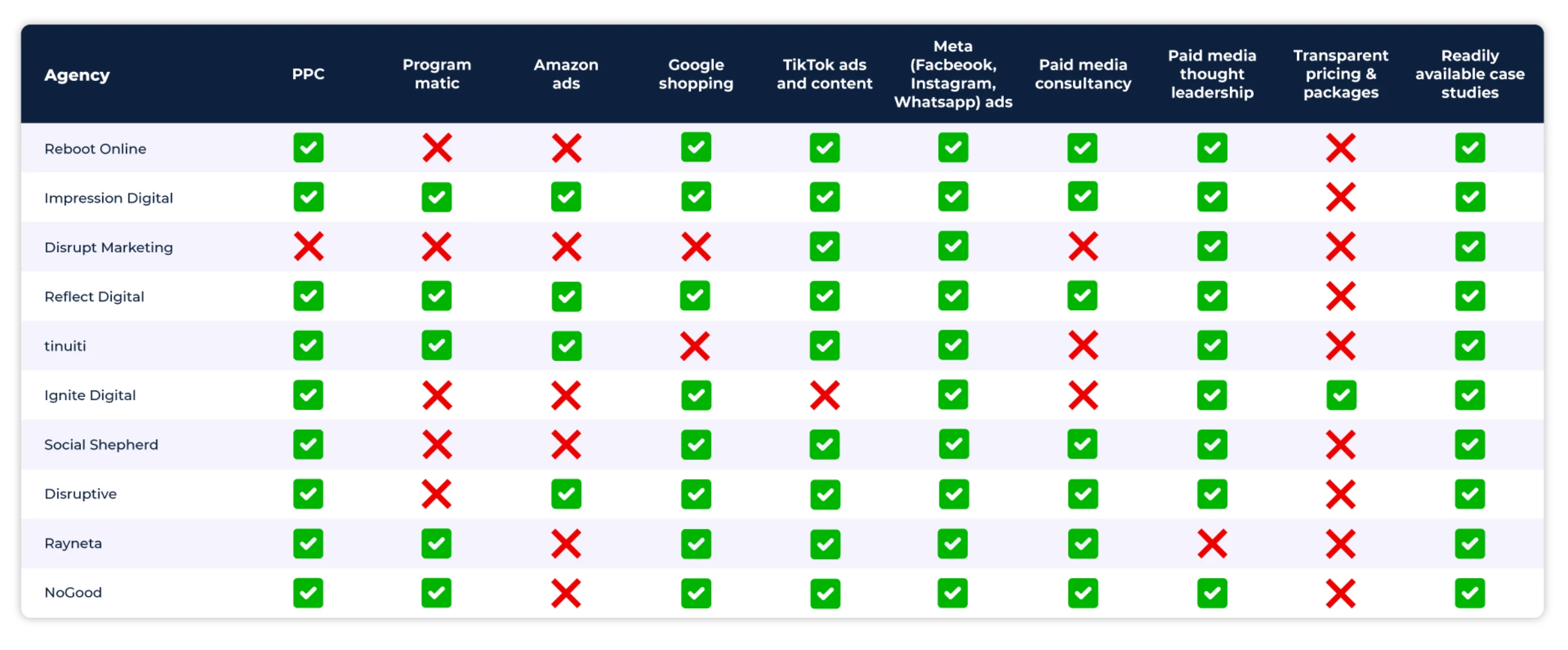 We’ve also analysed each agency’s paid media services to summarise what each offers. We have used criteria that we think make for the best paid media services and have scanned each agency’s website and social media presence to compare their offerings.